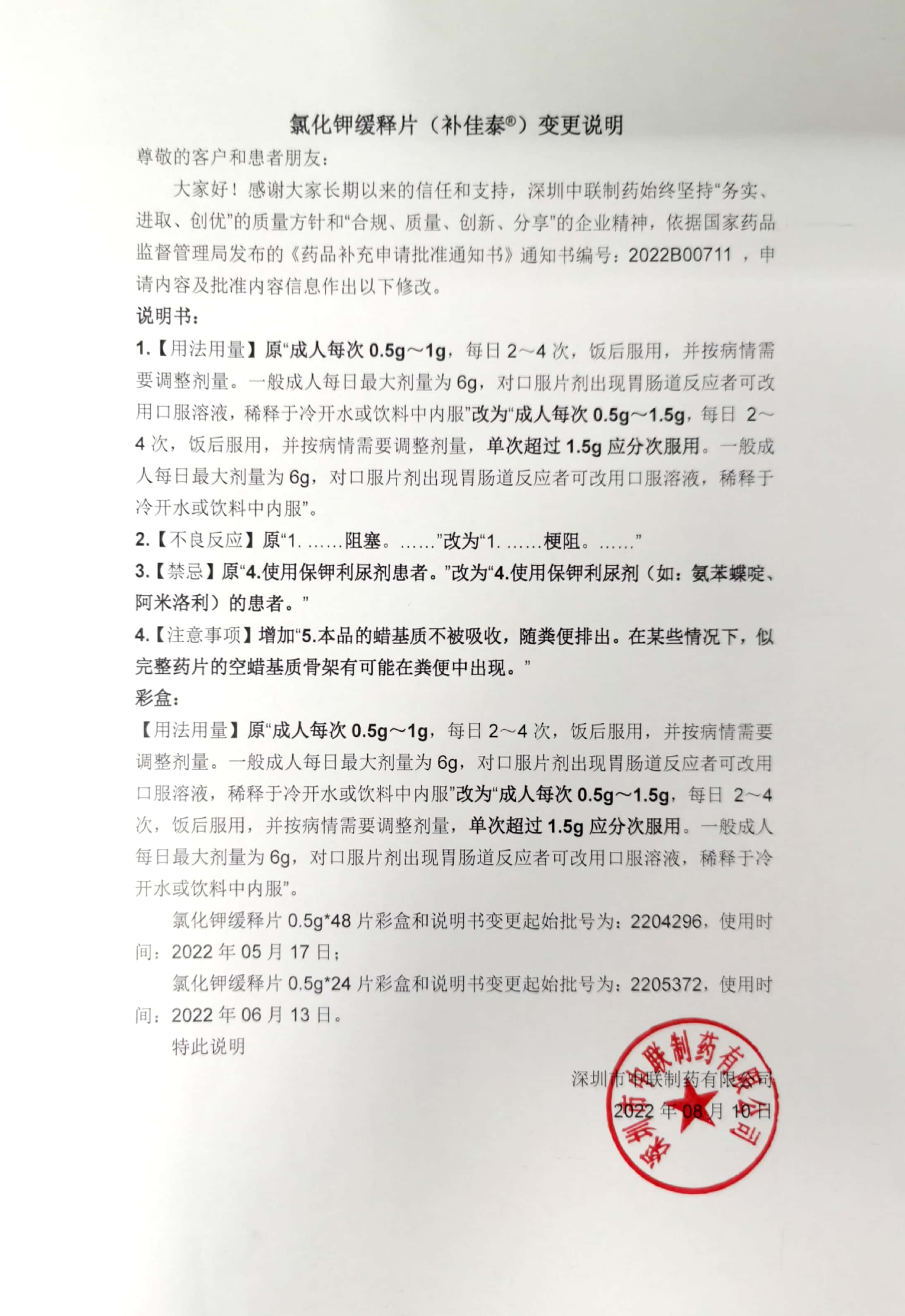 Potassium chloride sustained release tablets (bujiatai ?) Change description